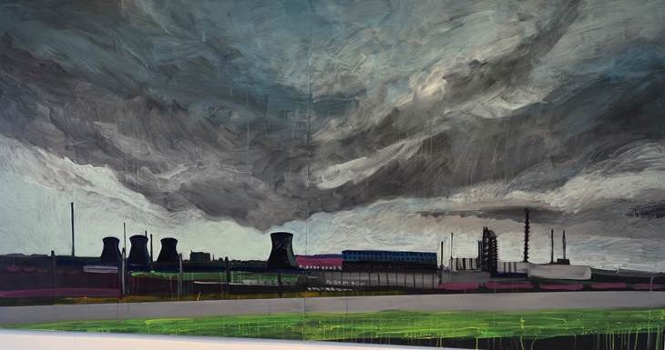 “Heavy Sky” shows the Grangemouth Oil Refinery with a huge grey and blue smoke cloud dominates over half of the image obliterating the light blue sky glimpsed and beautiful landscape around it. Particularly interesting are Greated’s thick brush stroked used to create the suffocating smog cloud and the sickly drips creating a melancholic and decaying scene.