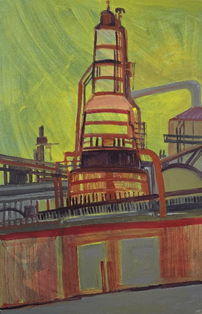 Photo ID: Portrait, acrylic painting of an oil refinery captured from below. The background shows streaks of an acidic green-yellow with the building in the front painted in oranges and reds and details in blue toned grey.